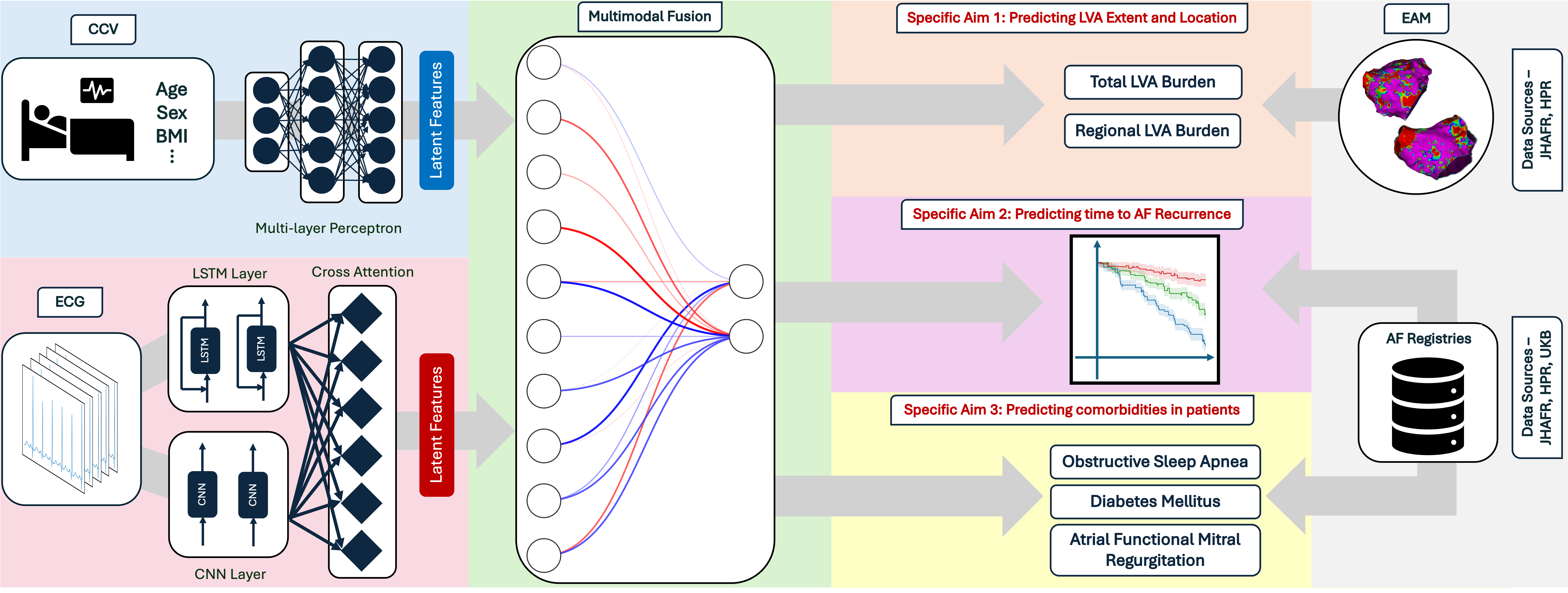 The project will develop and validate an artificial intelligence–enabled electrocardiography (AI-ECG) platform as a non-invasive tool for comprehensive AF care. This project draws on Ishan's previous AI/ML and computational modeling experience. Using large multi-center datasets of patients undergoing ablation, paired with electrocardiograms, electroanatomical maps, and detailed clinical profiles, Ishan and his colleagues will train and test advanced deep learning models to address three objectives, namely: 1) identify the extent and distribution of low-voltage areas (LVAs), 2) extend AI-ECG analysis to predict AF recurrence and time to recurrence after ablation, and 3) develop multimodal AI-ECG models that integrate clinical covariates to detect comorbidities such as obstructive sleep apnea, diabetes, and atrial functional mitral regurgitation, and evaluate their contribution to recurrence risk.